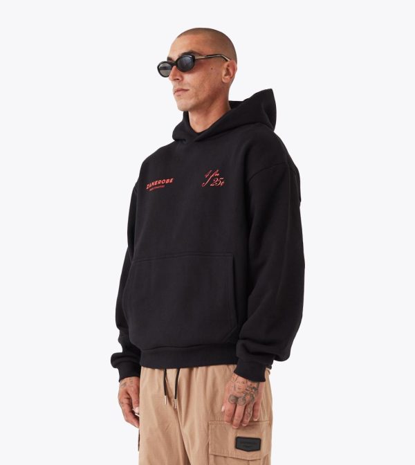 The ZANEROBE Fresh Produce Box Hood in Black blends bold design with a clean, modern shape. Made from a heavyweight cotton-poly blend, this hooded sweater sis oft yet built to last, with a relaxed fit and subtly cropped profile. The oversized hood and thick rib trims keep things sharp, while statement plastisol graphics front and back bring a hit of attitude. Finished with ZANEROBE’s signature ‘X’ stitch—this is your off-duty essential, elevated.