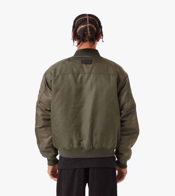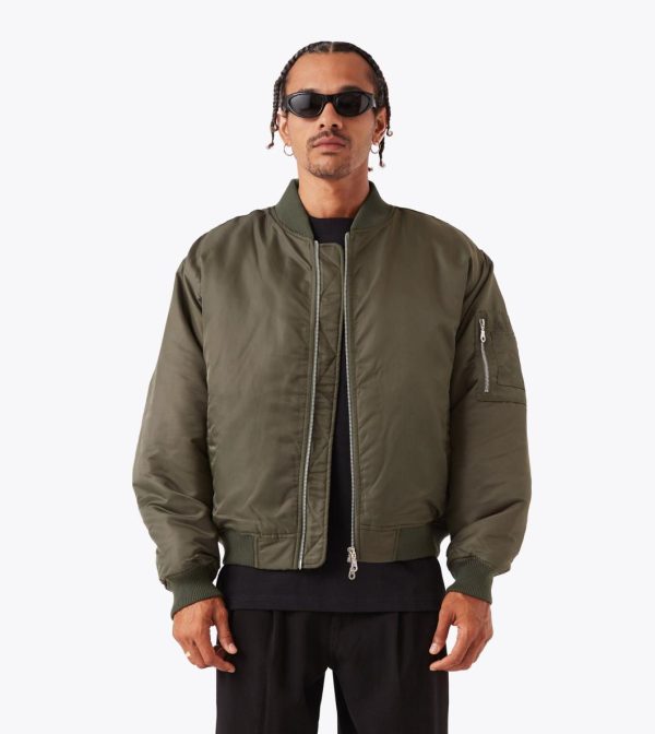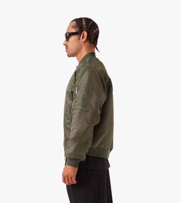 The ZANEROBE Sateen Bomber in Olive delivers a refined take on a classic silhouette, blending style with everyday functionality. Crafted from smooth 100% polyester sateen, this jacket is designed for both warmth and versatility, featuring wadded insulation and a double-ended aluminum zipper for adaptable wear. Ribbed detailing at the collar, cuffs, and hem ensures a secure yet comfortable fit, while a zippered sleeve pocket adds a practical edge. Finished with a backpack yoke and a rubber ZANEROBE patch, this jacket brings a sharp, modern aesthetic to any outerwear rotation.