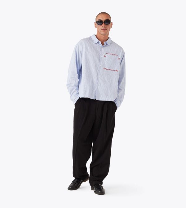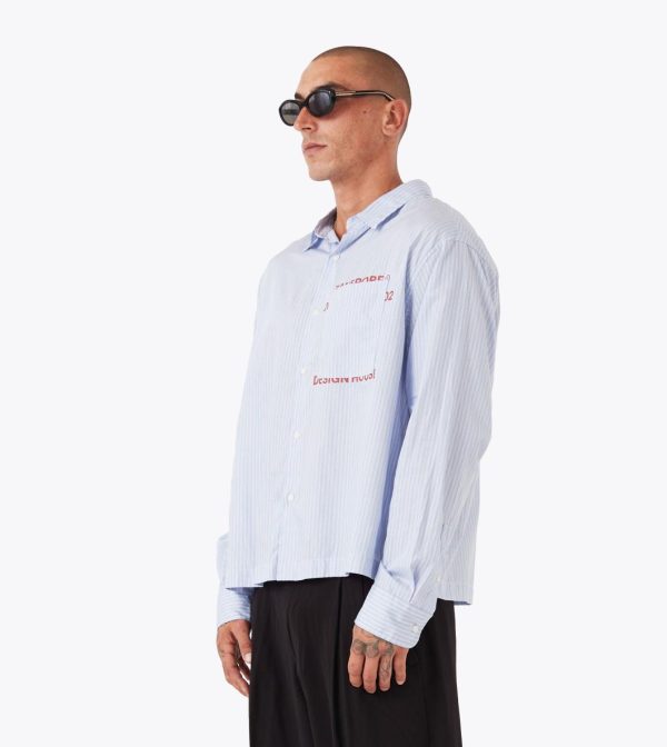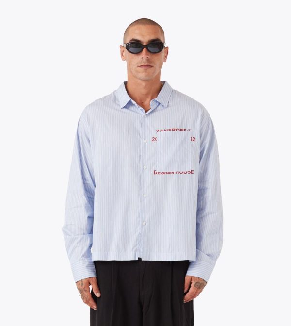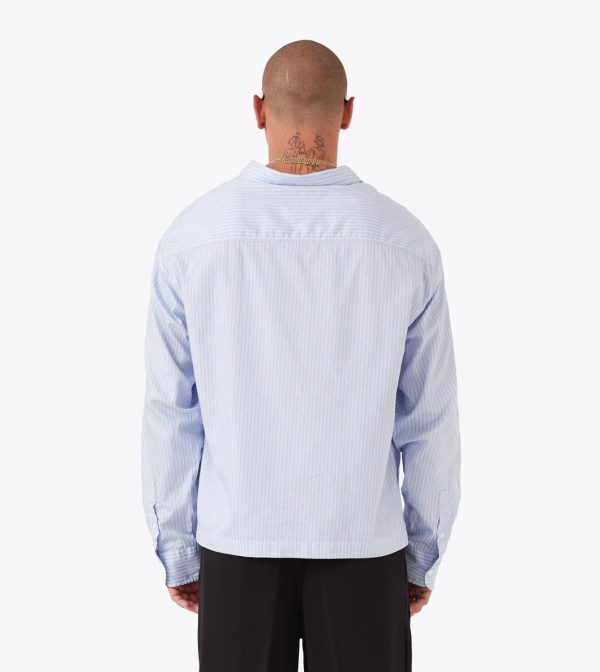 The ZANEROBE Overlap Crop LS Shirt in Blue Stripe is cut wide and cropped for a modern silhouette. Made from crisp yarn-dyed cotton poplin with a chest patch pocket that reveals subtle artwork underneath.