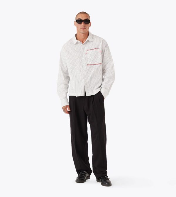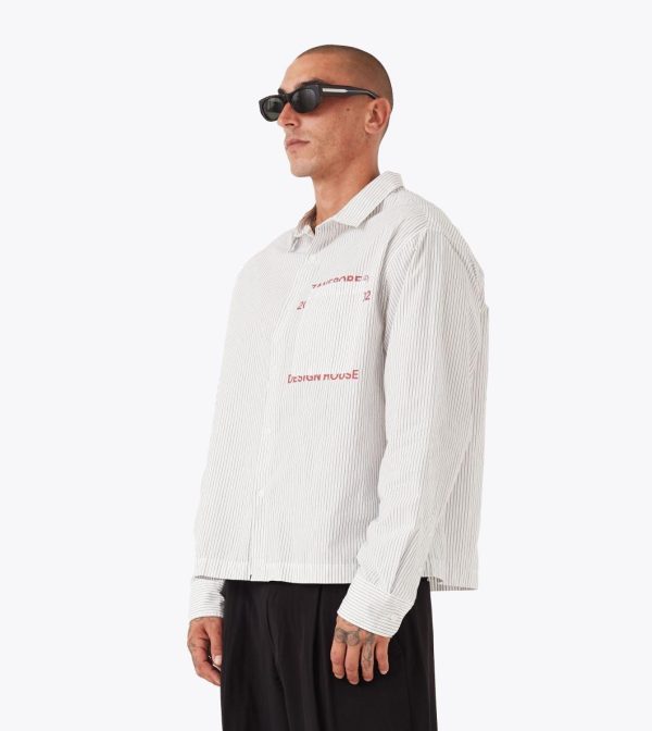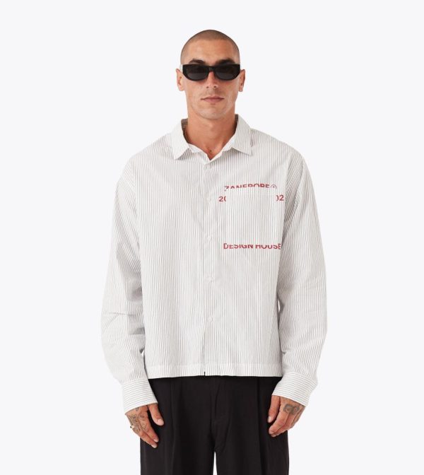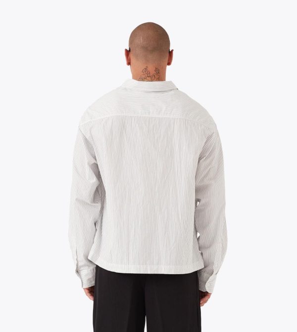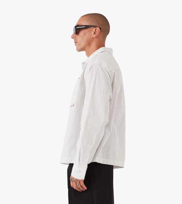 A fresh take on the classic button-up. The ZANEROBE Overlap Crop LS Shirt in White Stripe features a boxy, cropped fit in soft cotton poplin, finished with a hidden plastisol print beneath the chest pocket.