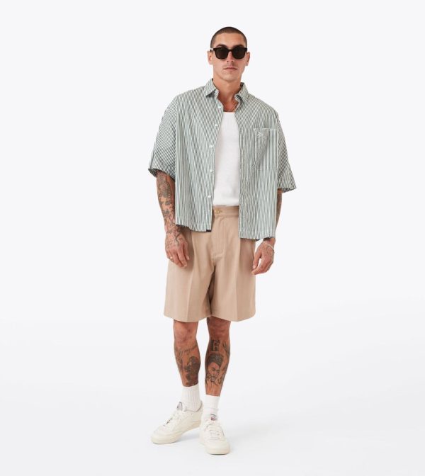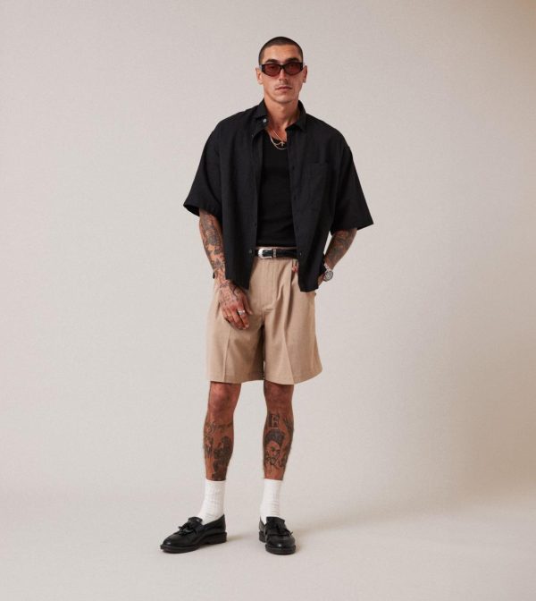 The Herringbone Flow Short in Beige is made from a blend of 63% polyester, 33% rayon, and 4% elastane herringbone suiting providing a comfort and durability. The 2 pleats at the front of the leg and relaxed fit give these shorts a classic, sophisticated look, perfect for any occasion. We recommend wearing them with a cropped shirt layered over a ribbed tank.