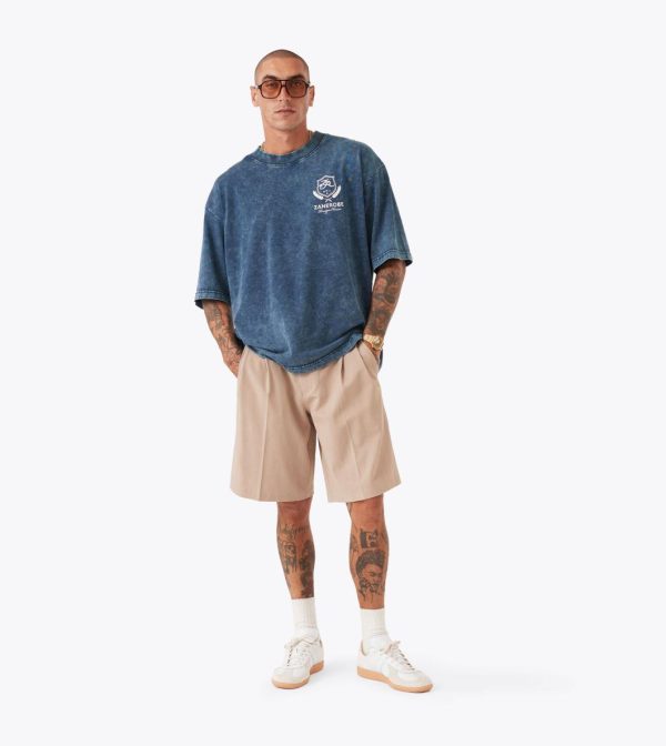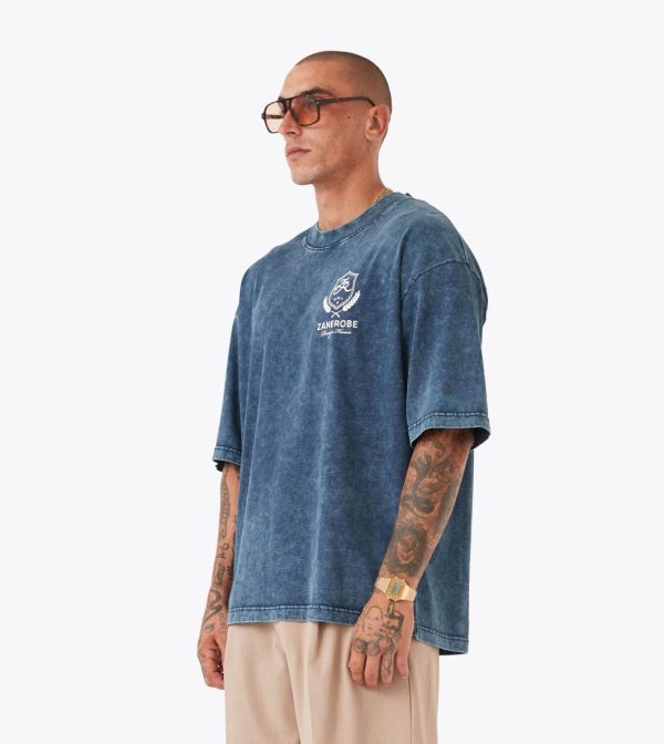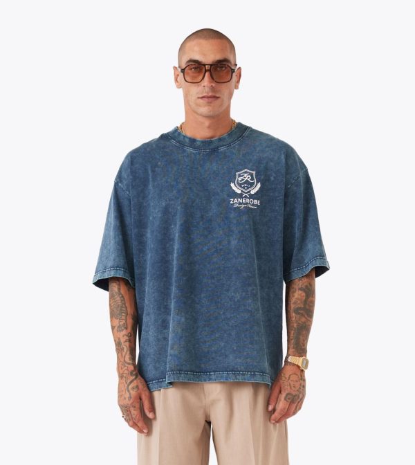 The ZANEROBE Crest Flow Tee in GD Navy combines elevated comfort with a distinct worn-in character. Made from heavyweight 100% heavyweight cotton jersey, it’s garment-dyed and enzyme-washed for a softly faded, vintage look. The oversized fit, drop shoulders, and thick rib neckband lend a structured drape, while bold plastisol graphics on the front and back bring visual impact. Finished with a clean back yoke, this tee is a contemporary essential with understated edge.