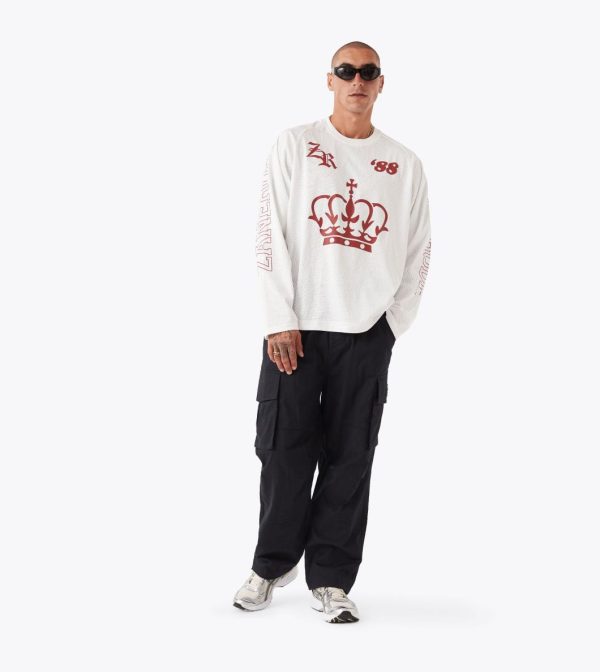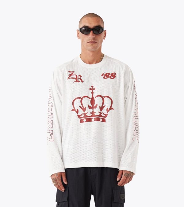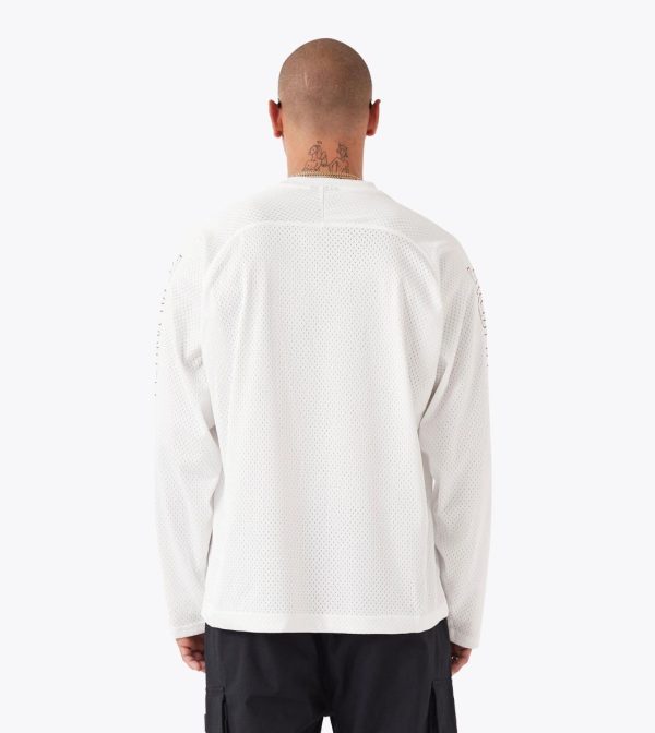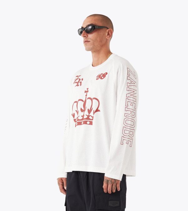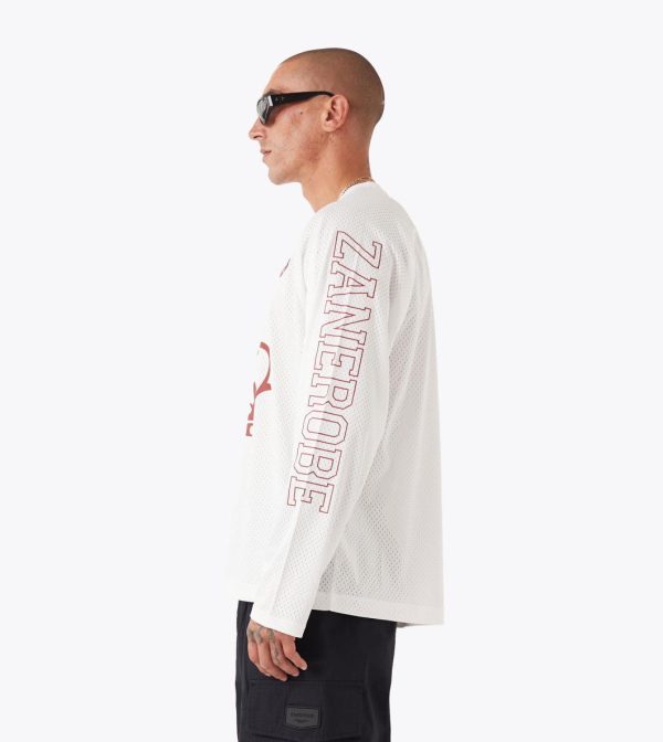 The ZANEROBE Mesh Hockey Jersey in Vintage White delivers a bold reinterpretation of vintage sport aesthetics. Constructed from breathable 100% poly mesh, this long sleeve tee offers a lightweight yet structured fit that’s designed to stand out. Statement plastisol graphics feature prominently across the chest and sleeves, creating a confident, layered look. Cut with a relaxed silhouette and standard length, this jersey balances nostalgic references with contemporary streetwear edge. Would you like a version that leans more into the cultural or style influences of hockey jerseys?